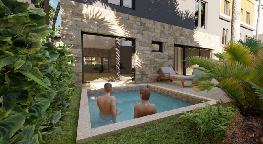 - Private outdoor terrace and pool (ground-floor units only): 41.93 m² – 56.51 m²