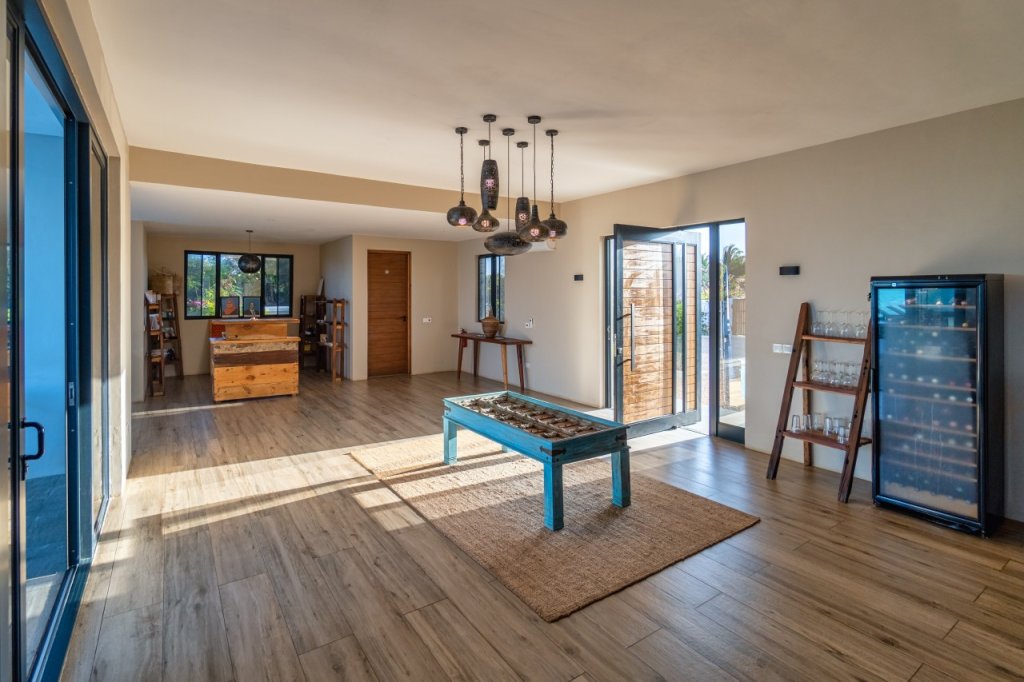 The main villa comprises approximately 800 sqm of built area, designed with contemporary architecture and generous open spaces. It features 4 en-suite bedrooms, additional guest bathrooms, a professional chef’s kitchen, and large living areas opening directly toward the ocean. The property includes a private swimming pool overlooking the sea, a pool bar with storage, and an expansive rooftop terrace offering panoramic sunrise and sunset views.