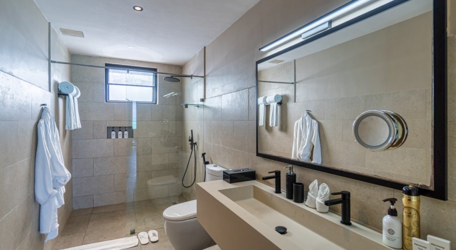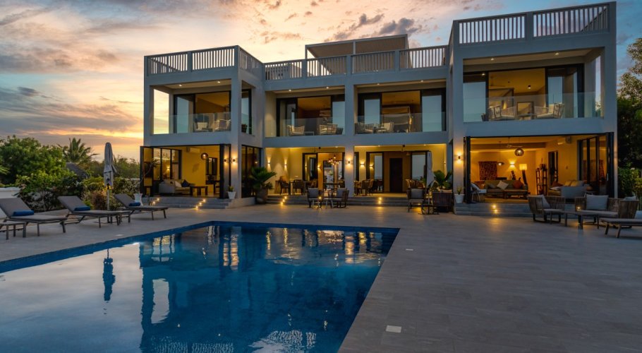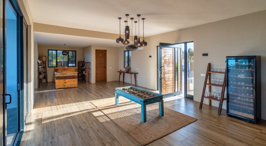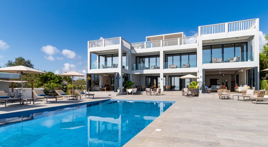 The main villa comprises approximately 800 sqm of built area, designed with contemporary architecture and generous open spaces. It features 4 en-suite bedrooms, additional guest bathrooms, a professional chef’s kitchen, and large living areas opening directly toward the ocean. The property includes a private swimming pool overlooking the sea, a pool bar with storage, and an expansive rooftop terrace offering panoramic sunrise and sunset views.
